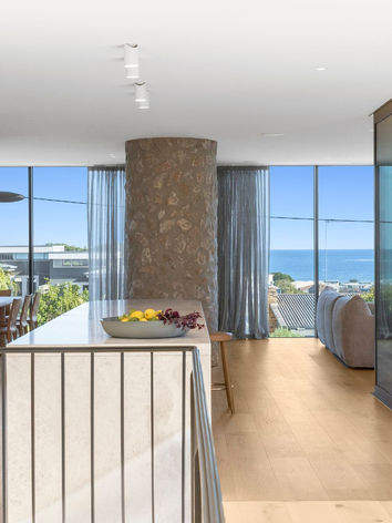 Inside, the home unfolds with soft curves, layered textures, and a flawless connection between indoor and outdoor spaces. At its heart, a stunning kitchen wrapped in natural stone anchors a free-flowing living and dining zone. Floor-to-ceiling glass invites the outdoors in, revealing glimpses of the ocean and flooding the space with light.