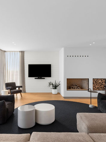 A stone-column feature and warm timber tones soften the architectural form, while custom lighting and natural finishes create a rhythm that feels intuitive, sophisticated and calm.